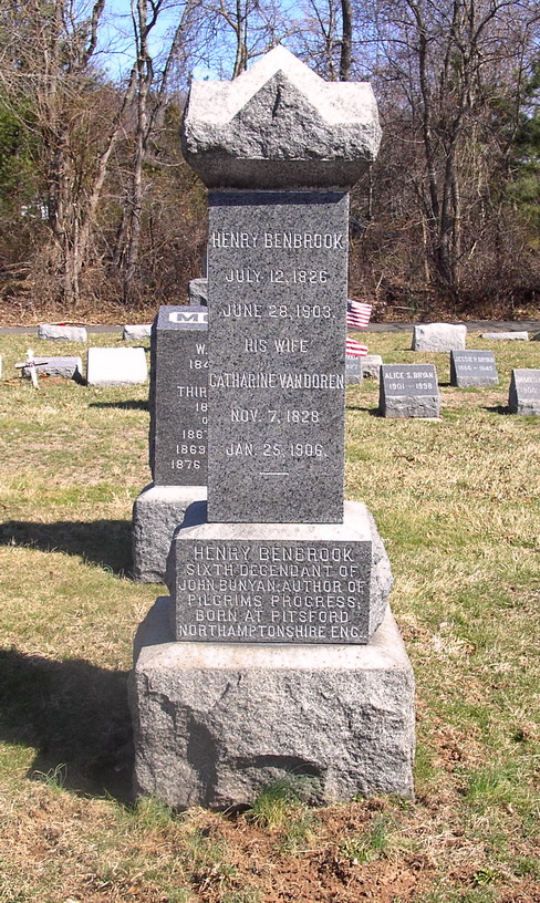 Sarah Brown and Stephen Benbrook today have many DESCENDANTS IN THE UNITED STATES, who can legitimately trace their descent from John Bunyan, the celebrated author of the Pilgrim's Progress. Many of these descendants still reside in Somerset County, New Jersey, where Sarah and William lived, and where they are almost certainly buried. Lineages descending from several of their children are well documented, including those of their aforementioned sons William Whitsey Benbrook and Henry Benbrook (Benbrook, 2025). In fact, Henry's tombstone inscription in Pluckemin Cemetery identifies him as a "Sixth Descendant of John Bunyan: Author of Pilgrims Progress". (A more detailed view of that inscription can be seen by clicking on the tombstone image on the right.)