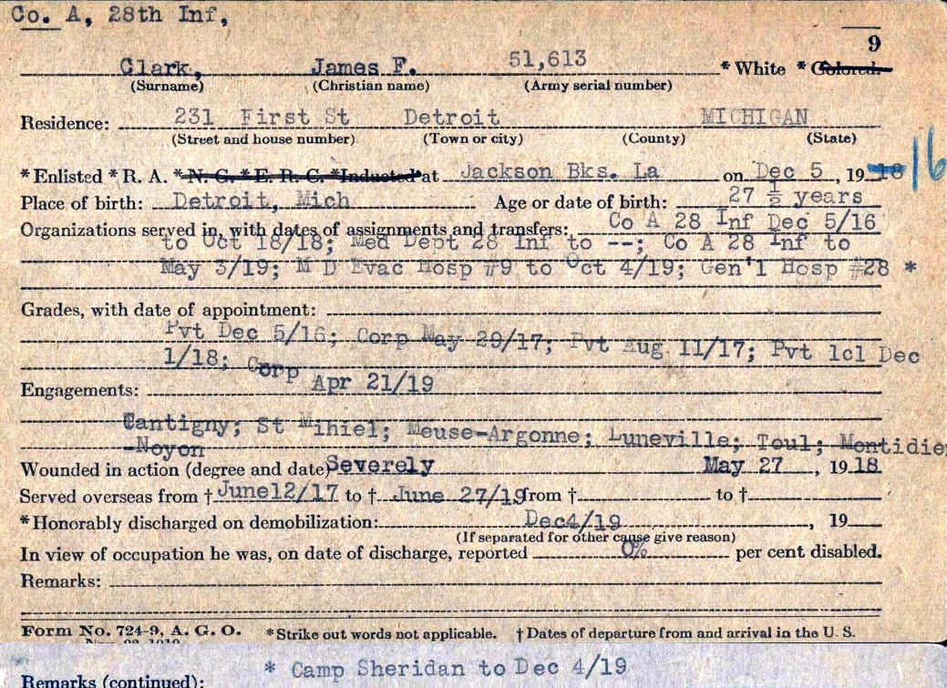 Wounded, gassed and shell-shocked, Jim was sent to the rear to recover in a field hospital. The head medical officer, regimental surgeon Lt. Colonel Clarence E. Fronk, [1] nursed Jim back to health. Many years later, after Fronk had become a close family friend, Fronk often joked that in order to repair Jim's wound he had "to graft a dog bone onto his heel". The U.S. Army on July 1, 1918 acknowledged that Private James F. Clark was severely wounded in action in an announcement of casualties that was made in the "Official Bulletin of Casualties Reported by Gen. Pershing" (U.S. Committee of Public Safety, v. 2, p. 7). This announcement lists "Amos Lemmons of 62 Thirty-second Street, Detroit, Michigan" as next-of-kin. The name Amos Lemmons surfaces once again in Jim's army records more than a year later in transport papers dated June 15, 1919, wherein Amos Lemmons is listed as a cousin. We believe that Amos is almost certainly Canadian-born August Emil Levandusky (1880-1969), who went in later years in the U.S. by the name of Amos Dusky. He was one of the sons of August Levandusky, and was a grandson of shoemaker Johann Lewandowski. Both the father and grandfather of Amos were born in West Prussia, Germany, immigrated in the 1880s to the U.S., and died in Detroit. Jim remained in the rear, out of action, for a short time during the summer of 1918. During this time, he sat out the main engagement of the Mondidier-Noyon offensive from June 9-13. For this reason, he may not have qualified for a Mondidier-Noyon battle clasp, despite having been wounded at the Battle of Cantigny. He also missed the battles of Soissons, Saizerais and Vancoulers, which were part of the Aisne-Marne offensive of July 18 to August 6. His wounds apparently had healed shortly after the latter offensive, as he was back by September with the 1st Division at the front.