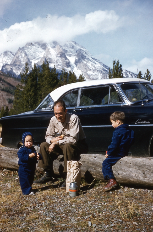 Dad and the kids in the Tetons with the 1952 Ford Victoria.