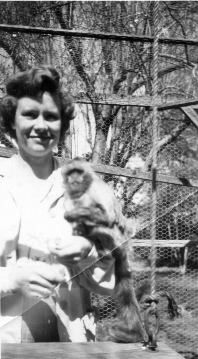 Mom was home from college one summer when she walked by her parents open bedroom door, and saw the monkey sitting on mother's vanity getting into her mother's make up and making a big mess. She hollered at the rascal to stop, but instead he turned around, screamed back, and came racing after her with his teeth bared. Mom took off running with the monkey in hot pursuit, and locked herself in her bedroom with the monkey hanging outside on the doorknob screeching. Granny and Grandpa thought this was hilarious, and laughed and laughed about it much to Mom's embarassment. However, the monkey one day made the mistake of biting grandpa, so he banished it to a cage in the basement. Then a short time later, the monkey disappeared altogether.