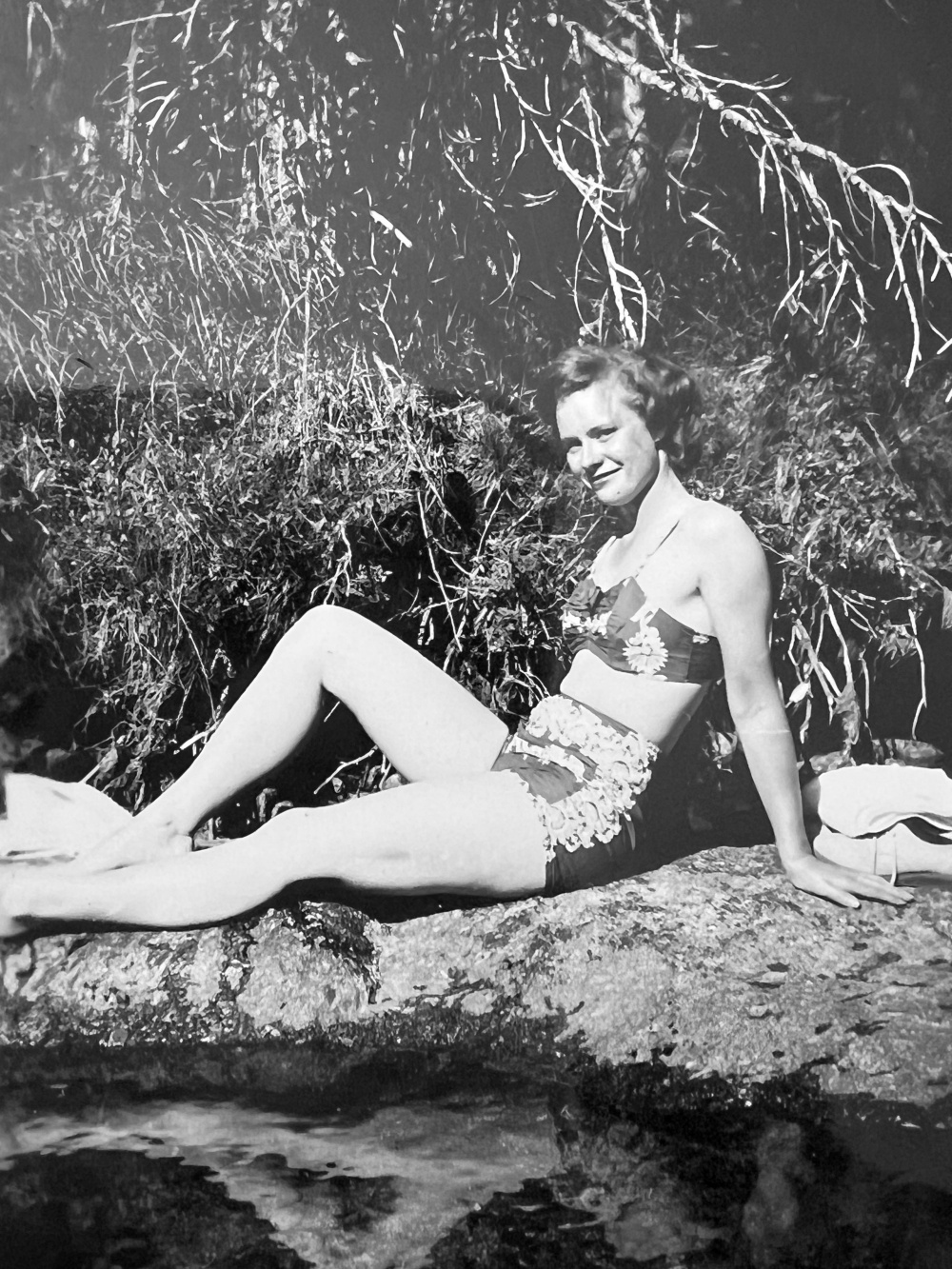 Santa Cruz and Berkeley - Mom from the Fall of 1945 up until January 1951 attended the University of California at Berkeley. Her mother by now had recovered from polio and moved with Rosamond back home to be with Jack, which precipitated in Mom's family moving to Santa Cruz. Thus Mom lived in the dorms on the Berkeley campus during the school year and spent summers with her folks and Rosamond in Santa Cruz. They lived at first at a motel that they managed on Old Highway 1 near Natural Bridges beach on the north side of town. Back then, the motel was probably located close to where Baldwin St, which was an extension of Escalona Dr, intersected Mission St (Highway 1). Today, Baldwin St has been replaced by a line of apartments, and Escalona ends where it makes a T-intersection with Grandview St. However, we do not know for sure where the motel was located. Sadly, Mom's dog Peggy was hit by a car somewhere out in front of the motel.