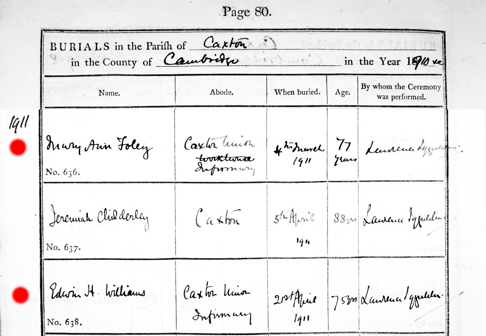 Edwin's common-law wife Mary Ann Foley died under her maiden name on Feb. 27, 1911 in the infirmary of the Caxton Union Workhouse, and was buried a few days later on March 4, 1911 in the Church of St. Andrew Cemetery, probably in an unmarked pauper's grave. Edwin died a few weeks later on April 17, 1911 in the same infirmary, and was buried under the name of Edwin H. Williams on April 21, 1911 in the Church of St. Andrew Cemetery, as well. As with Mary's burial, his was probably in an unmarked pauper's grave. His death certificate lists him as a "retired organist". Because Mary and Edwin appear under their birth names on the same page of the Caxton Cemetery burial register (shown on the the right), this confirms their identities. There is a Wikipedia Article on Edwin Boddington.